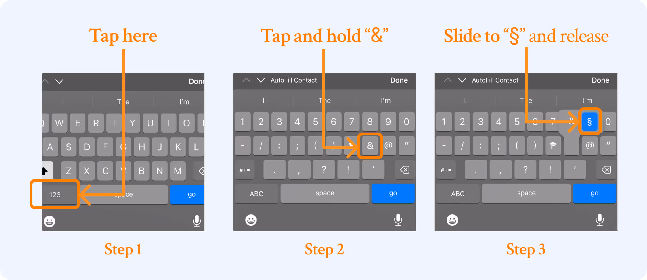 On an iPhone keyboard, press the 123 key to switch to the numeric keyboard. Then, press and hold the ampersand (&) key. A pop-up will appear—slide your finger to the § symbol and release to insert it.